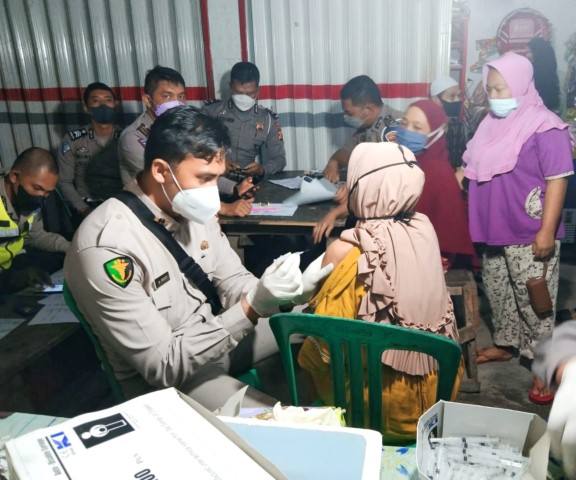 Personil Sat Lantas Polres Inhil beserta Tim Vaksinator Polres Inhil turun langsung untuk melakukan vaksin ditempat di sejumlah kawasan permukiman dan pasar di sekitar Kota Tembilahan, Minggu (19/12/21).