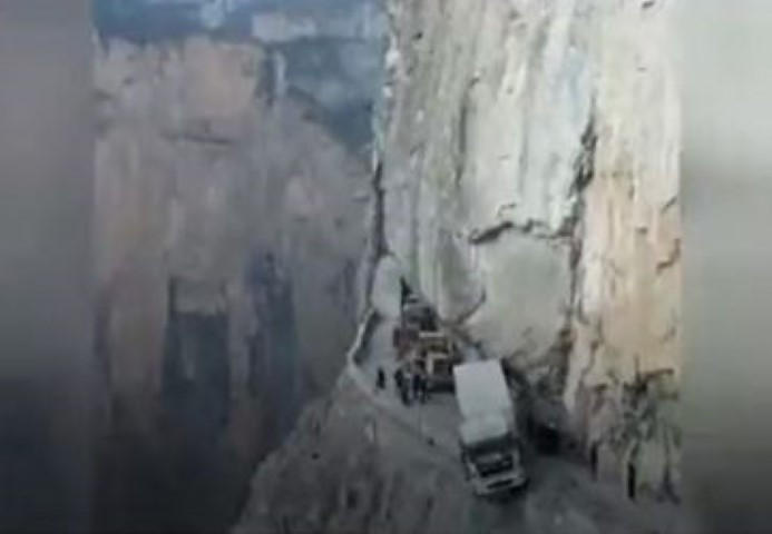 Rekaman video yang diunggah situs berita CGTN menunjukkan bagaimana truk bergelantungan di tepi tebing di jalan pegunungan di Provinsi Shanxi, China utara.