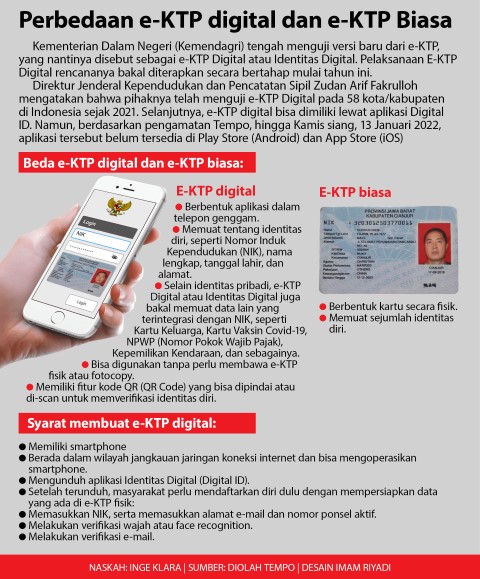 Direktur Jenderal Kependudukan dan Pencatatan Sipil Zudan Arif Fakrulloh mengatakan bahwa pihaknya telah menguji e-KTP Digital pada 58 kota/kabupaten di Indonesia sejak 2021. Selanjutnya, e-KTP digital bisa dimiliki lewat aplikasi Digital ID. Namun, berdasarkan pengamatan Tempo, hingga Kamis siang, 13 Januari 2022, aplikasi tersebut belum tersedia di Play Store (Android) dan App Store (iOS)