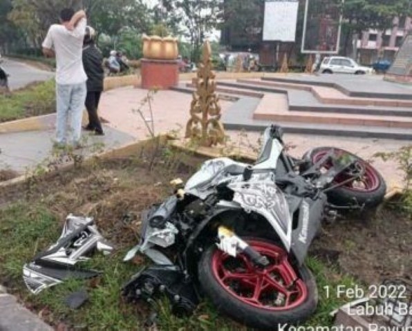 "Sesampainya di Bundaran Tugu Songket mengalami hilang kendali dan menabrak Bundaran Tugu Songket dan pot bunga yang berada di Tugu Songket tersebut," ujar Angga.