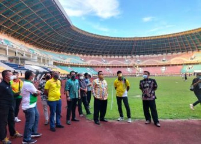 PEKANBARU (INDOVIZKA) - Sekretaris Daerah Provinsi (Sekdaprov) Riau, SF Hariyanto meninjau kondisi Stadion Utama Riau di jalan Naga Sakti, Pekanbaru, Kamis (17/2/2022).