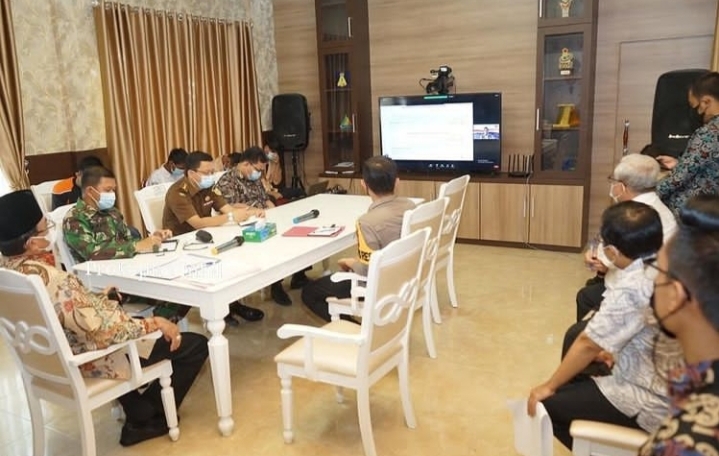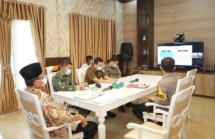 TEMBILAHAN (INDOVIZKA)- Bupati Indragiri Hilir HM. Wardan didampingi unsur Forkopimda mengikuti secara virtual Rapat Kordinasi Penanganan Covid 19 dan Mitigasi Bencana di Prov. Riau yang dihadiri kepala BNPB RI dari ruang multimedia Diskominfopersantik Kabupaten Indragiri Hilir, Kompleks Kantor Bupati Jl. Akasia No. 1 Tembilahan, Kamis (22/4/2021).