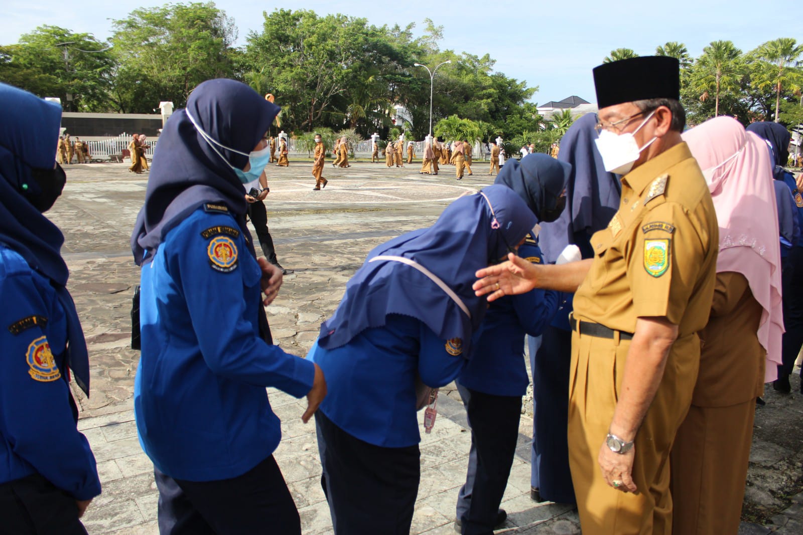 selesai gelar apel gabungan, acara dilanjutkan dengan halal bihalal saling maaf memaafkan mengambil momen idul Fitri 1443 H.