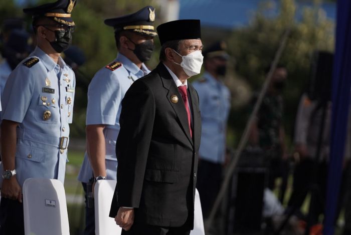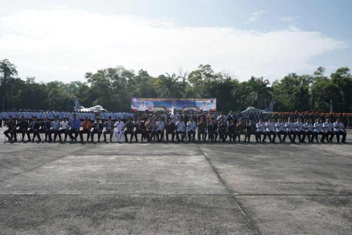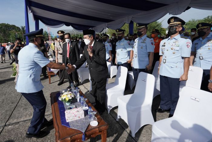 PEKANBARU- Gubernur Riau Syamsuar menghadiri upacara Serah Terima Jabatan Komandan Pangkalan Udara Roesmin Nurjadin (Lanud RsN) Pekanbaru di Apron Baseops Lanud Roesmin Nurjadin Pekanbaru, Senin (27/6/2022).