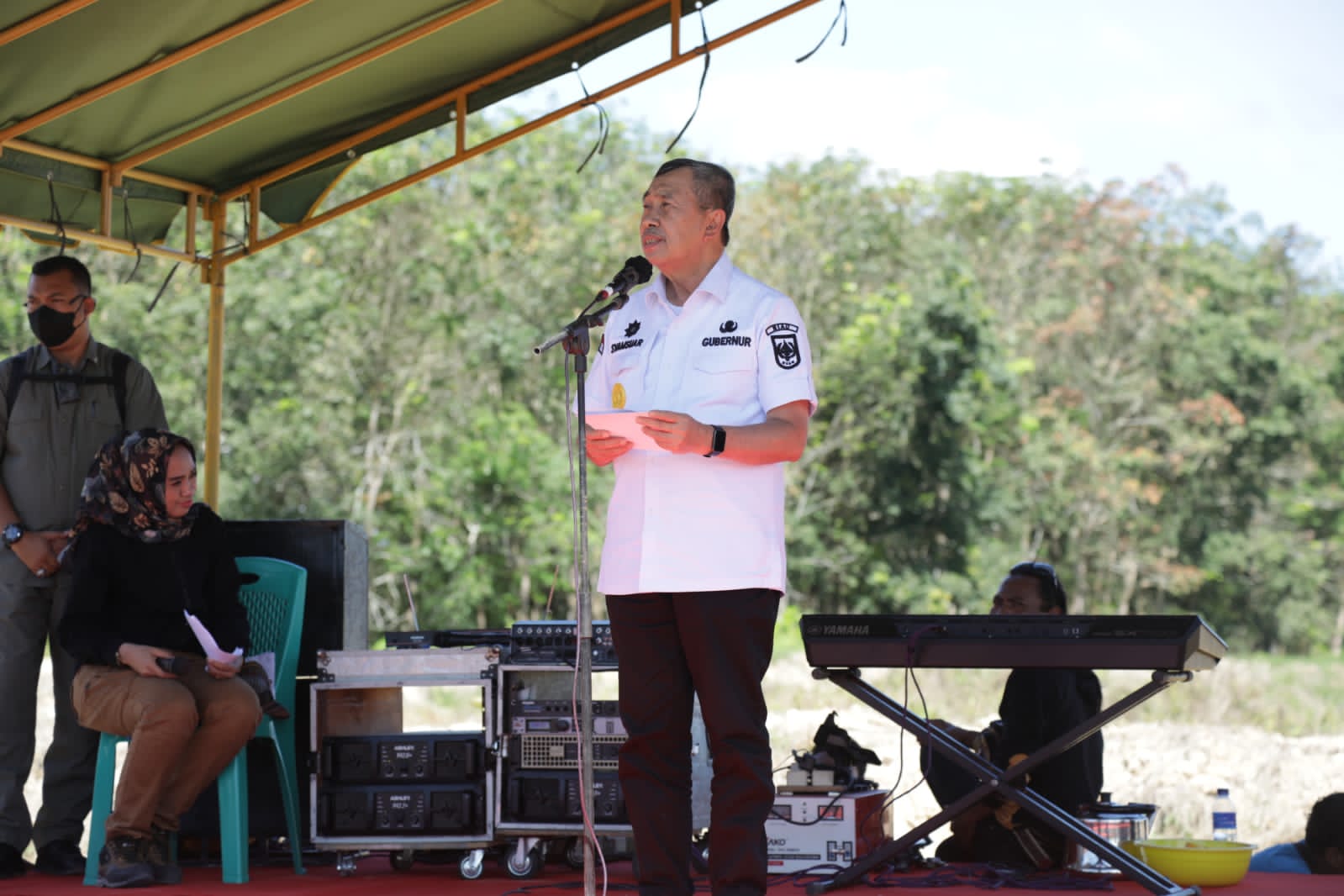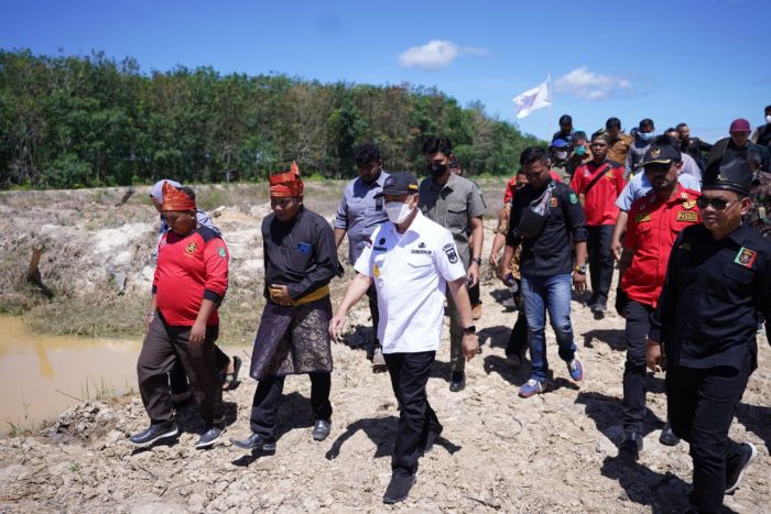 ROHUL- Gubernur Riau (Gubri) Syamsuar melakukan seremonial penanaman pohon aren dan penebaran benih ikan arwana di kawasan rawa seribu Kecamatan Tambusai Utara Kabupaten Rokan Hulu (Rohul), Senin (4/7/22).