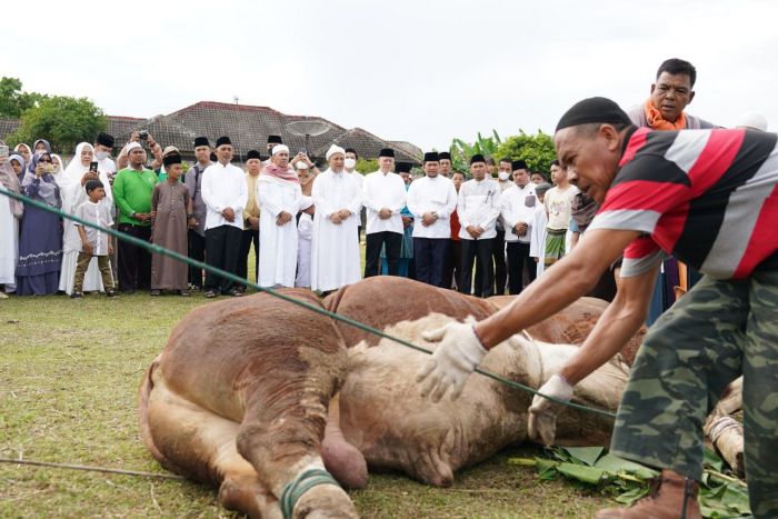 Kehadiran kami sekaligus menyampaikan salam dari bapak Preseiden RI dimana beliau setiap tahun memberikan sapi kurbannya kepada masyarakat Provinsi Riau. Memang yang mengatur ini diminta dari kami,” ujar Syamsuar.