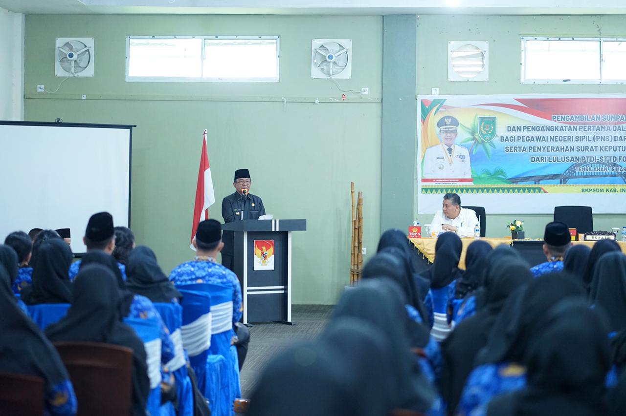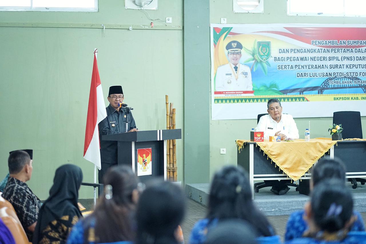 TEMBILAHAN, INDOVIZKA.COM- Pemerintah Kabupaten (Pemkab) Indragiri Hilir (Inhil) menggelar Pelantikan dan Pengambilan Sumpah Janji Pegawai Negeri Sipil (PNS), Pengangkatan Pertama Pejabat Fungsional serta Penyerahan SK CPNS Lulusan PTDI-STTD Kementerian Perhubungan di Lingkungan Pemerintah Kabupaten Inhil, Rabu (15/03/2023) di salah satu Hotel yang ada di Tembilahan.