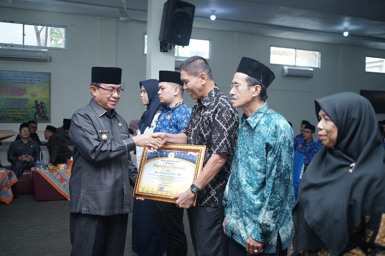 Dalam kesempatan ini juga dilaksanakan pemberian piagam purna bakti kepada PNS yang memasuki batas usia pensiun di lingkungan Pemkab Inhil.