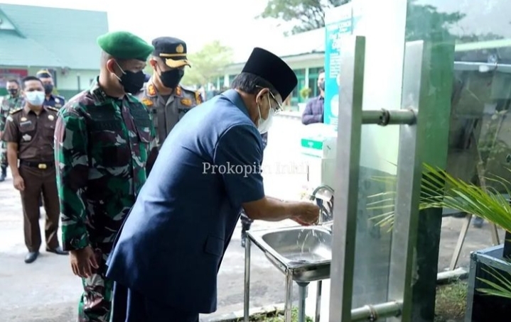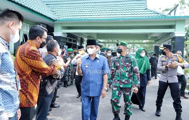 TEMBILAHAN, (INDOVIZKA)- Bupati Inhil H. M. Wardan dan Dandim 0314/Inhil Letkol Inf. Imir Faishal bersama Forkopimda Kabupaten Indragiri Hilir mengikuti secara Virtual peringatan HUT ke - 76 TNI yang dilaksanakan di Istana Merdeka dari aula Graha Bhakti Makodim 0314/Inhil, Jalan Ahmad Yani Parit 9 Tembilahan, Selasa, (05/10/21).