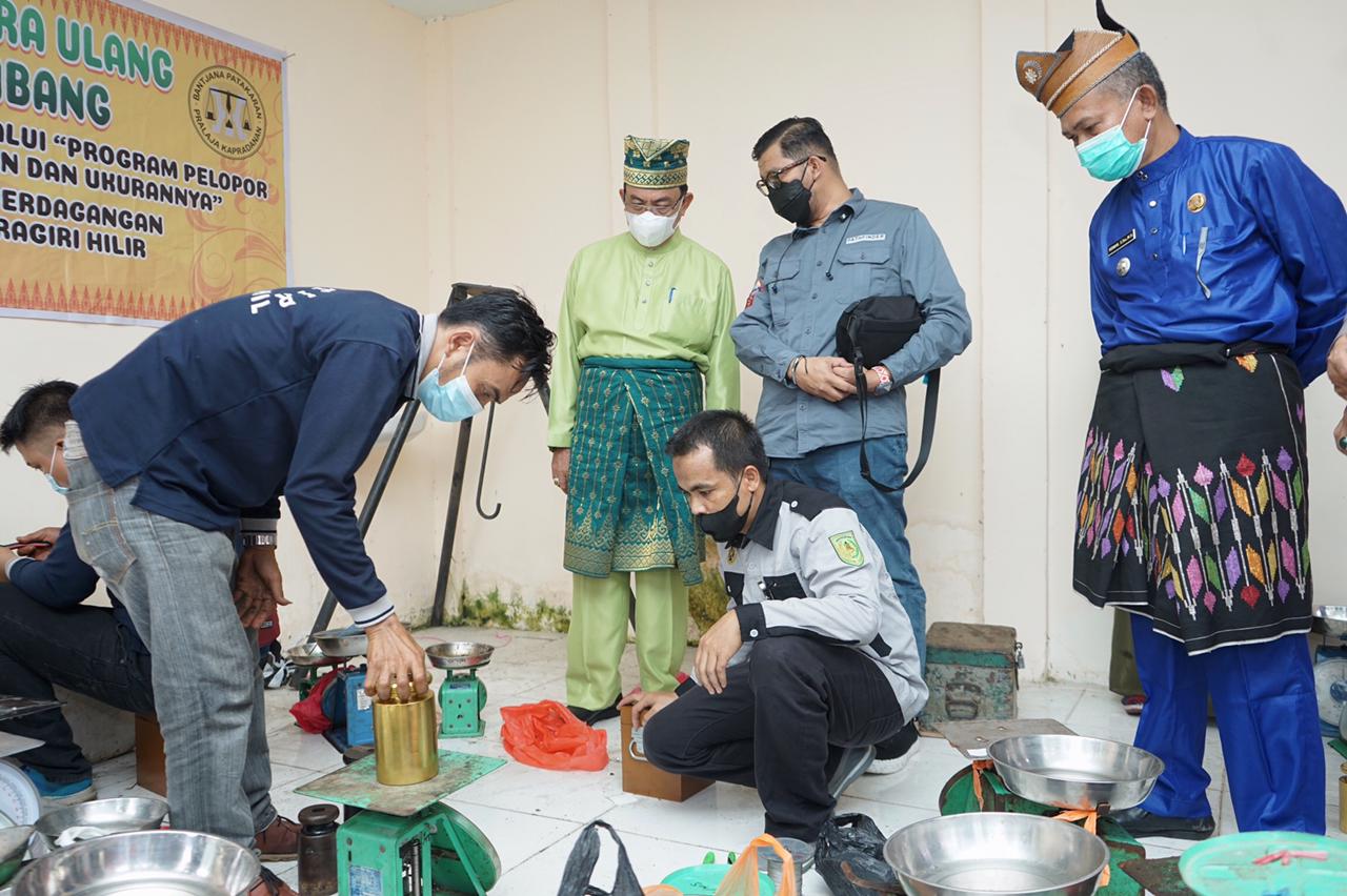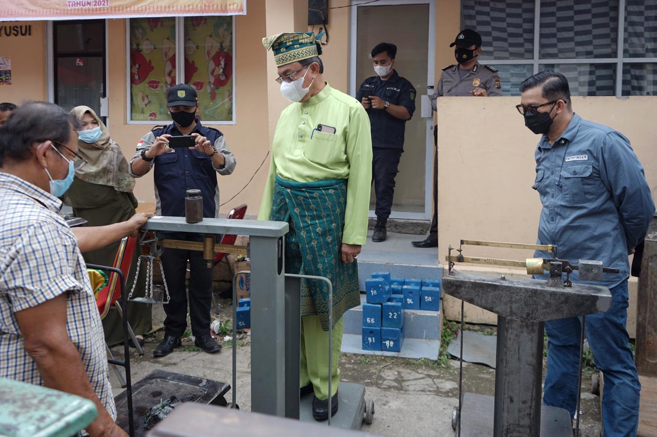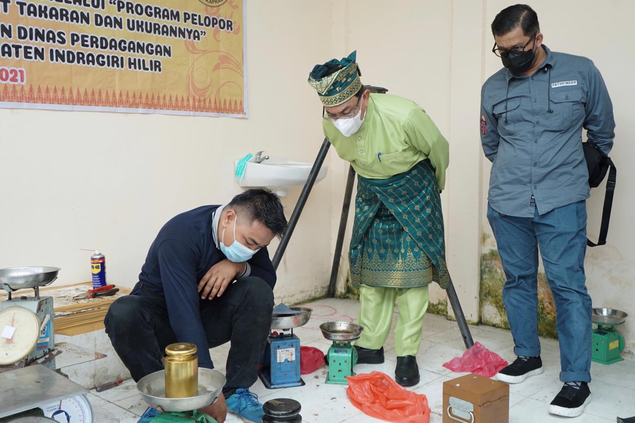 TEMBILAHAN, (INDOVIZKA) - Bupati Indragiri Hilir (Inhil) HM Wardan meninjau sidang tera ulang alat Ukur, Takar, Timbang dan Perlengkapannya (UTTP) di Pasar Umbut Kelapa, Jalan Kayu Jati, Parit 10, Tembilahan Hulu, Jumat (16/07/2021).