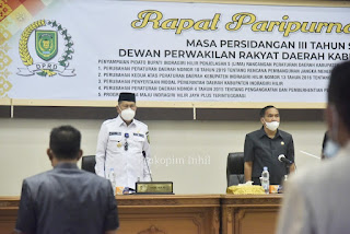 TEMBILAHAN, (INDOVIZKA)- Wakil Bupati Kabupaten Indragiri Hilir H Syamsuddin Uti menghadiri sekaligus menyampaikan pidato perubahan 5 Rancangan Peraturan Daerah (Ranperda) pada Rapat Paripurna Ke-18 Dewan Perwakilan Rakyat Daerah (DPRD) Inhil di Jalan Soebrantas Tembilahan, Kamis (14/10/2021).