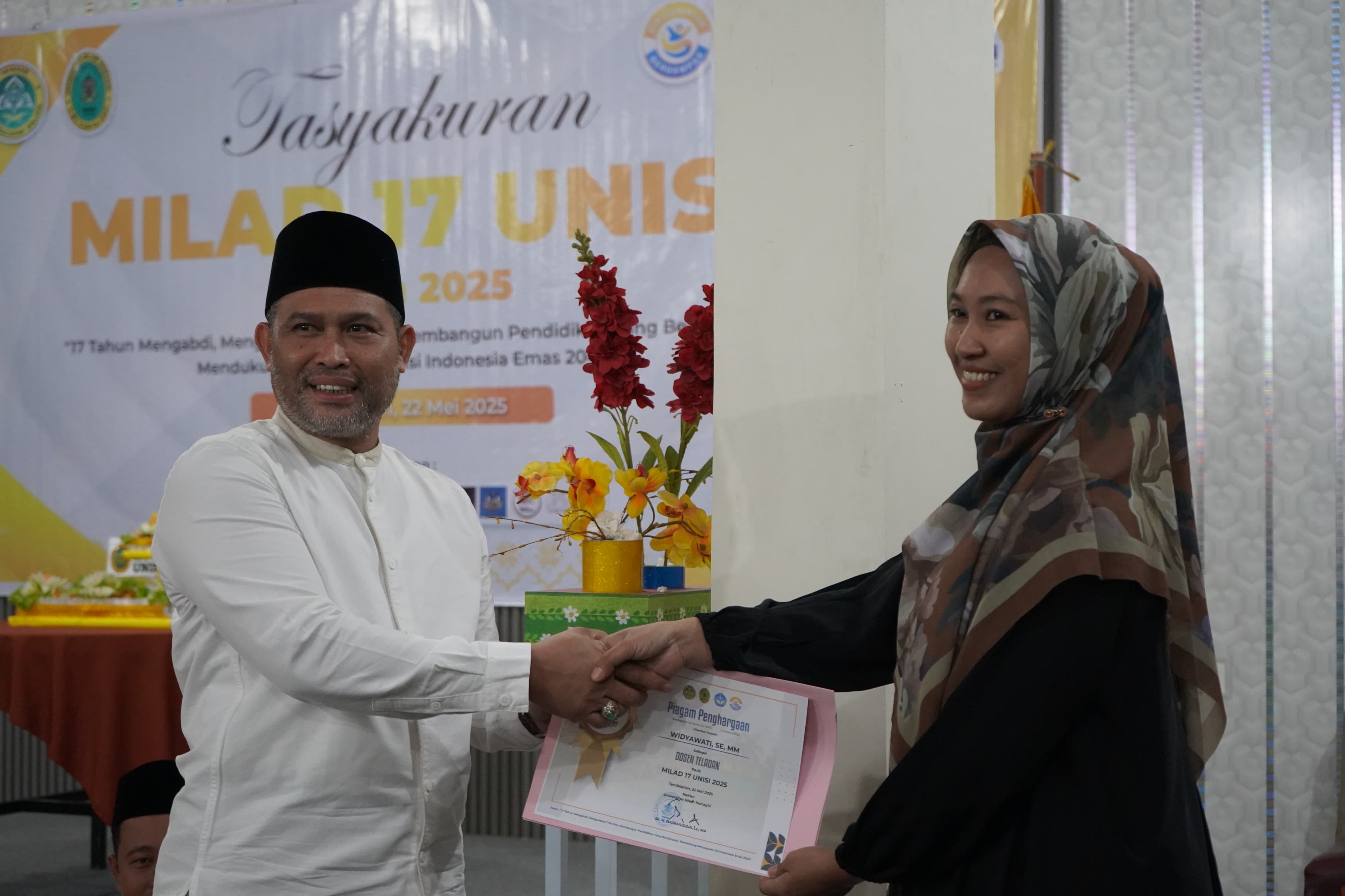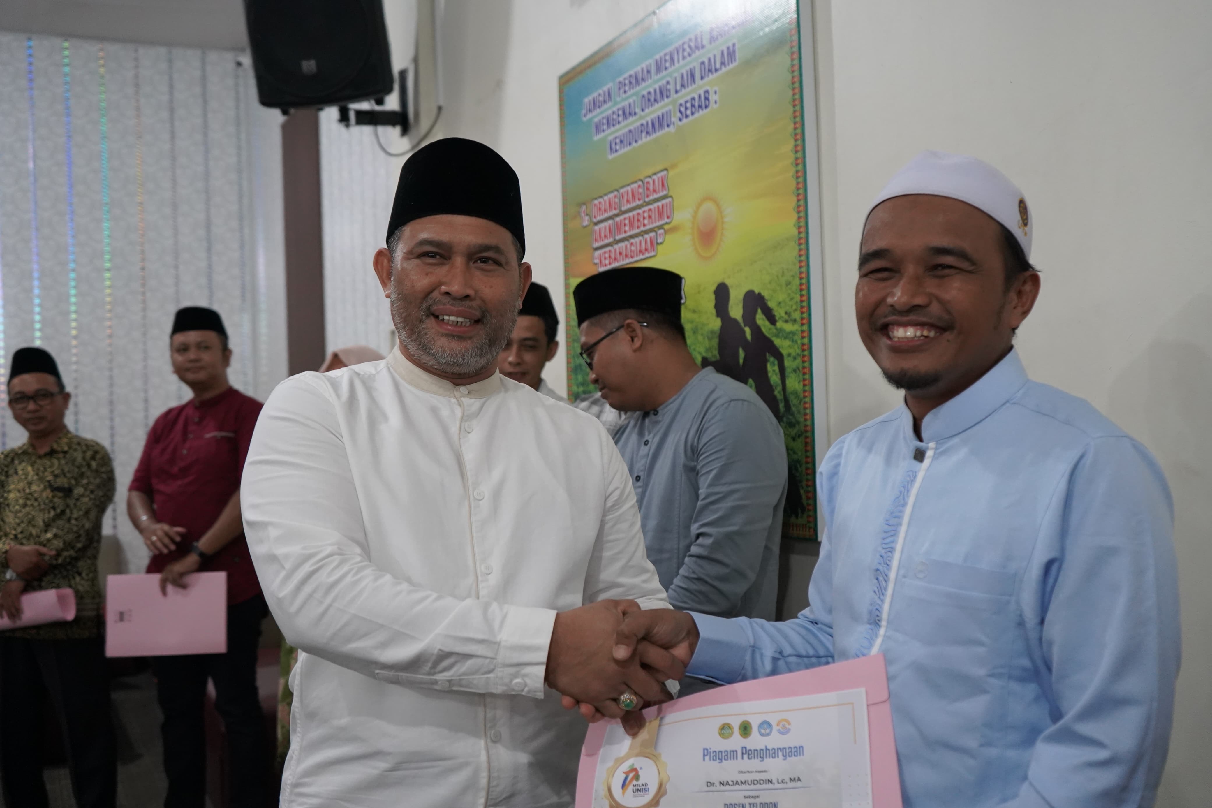 Sebagai bentuk penghargaan terhadap dedikasi tenaga pendidik, di akhir acara turut diserahkan piagam penghargaan kepada beberapa dosen UNISI yang terpilih sebagai dosen teladan.