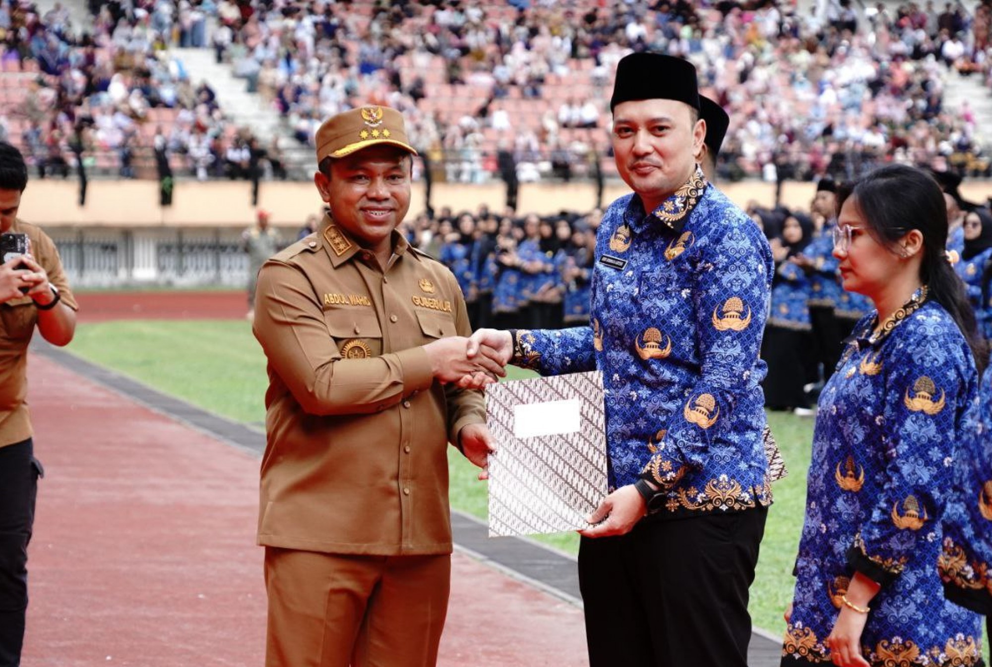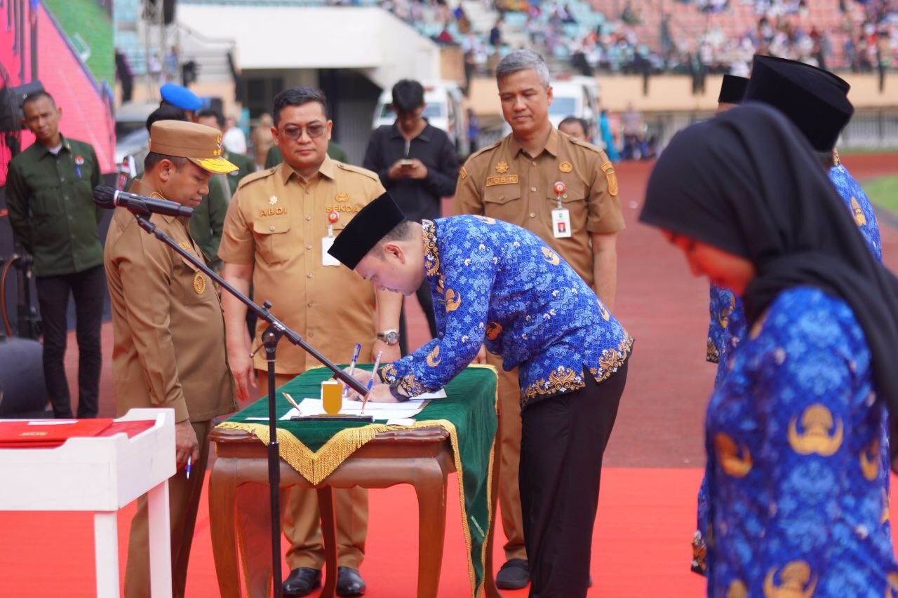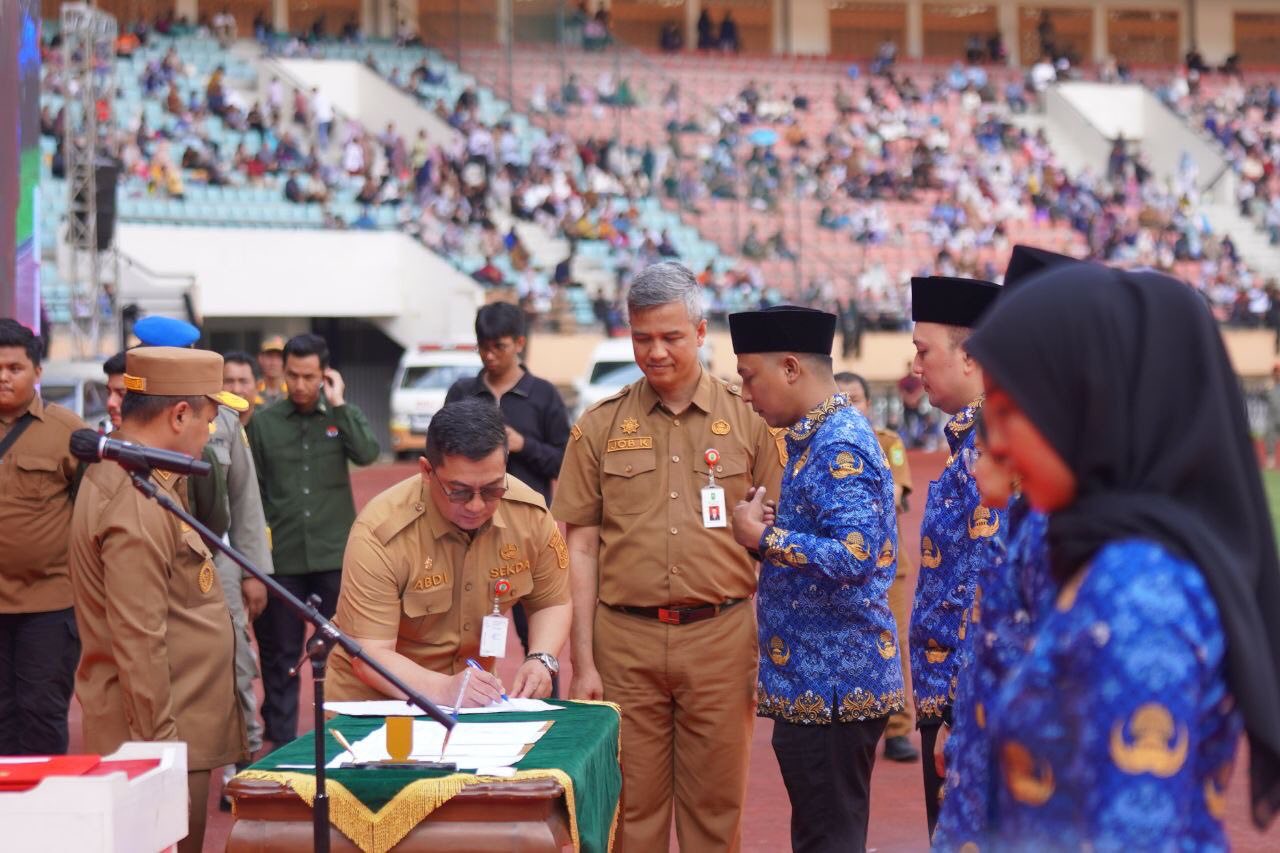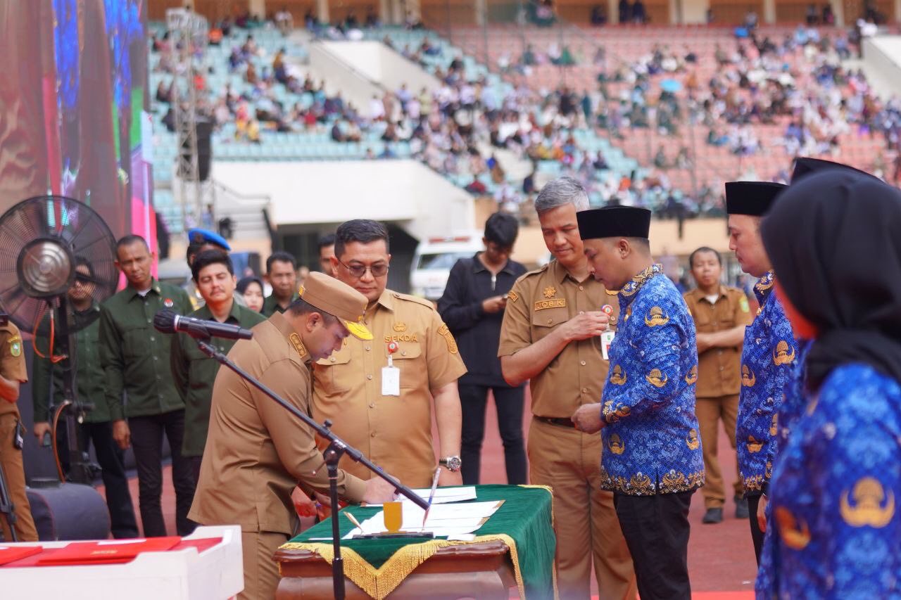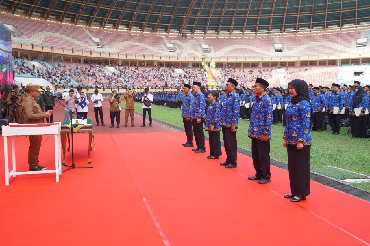 PEKANBARU, INDOVIZKA.COM - Sebanyak 5.884 Pegawai Pemerintah dengan Perjanjian Kerja (PPPK) resmi dilantik Gubernur Riau, Abdul Wahid di Stadion Utama Riau Pekanbaru, Senin siang (29/9/2025). Pelantikan ini terdiri dari 4.406 peserta yang lulus seleksi tahap pertama dan 1.478 peserta dari tahap kedua. Meski terik matahari menyengat, semangat para peserta tak surut sedikit pun. Sorak dukungan keluarga menambah suasana khidmat bercampur haru.