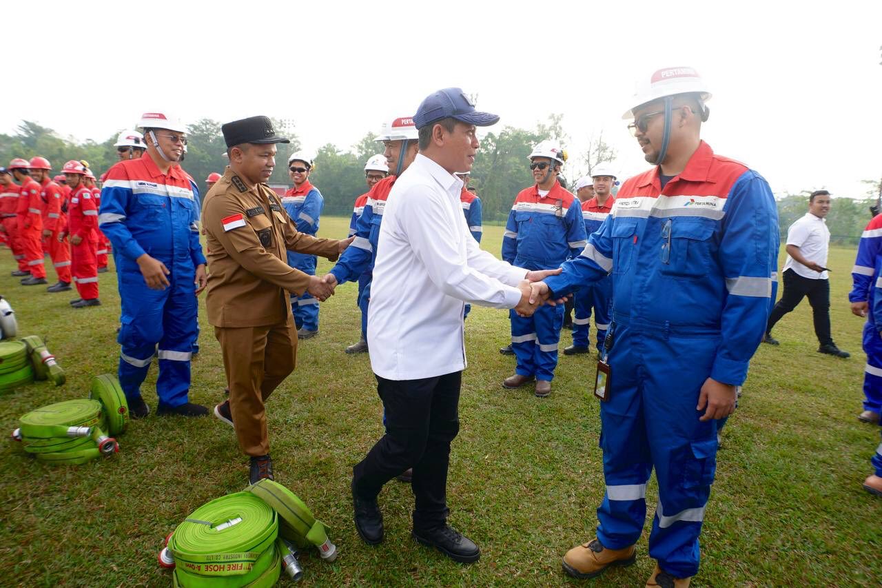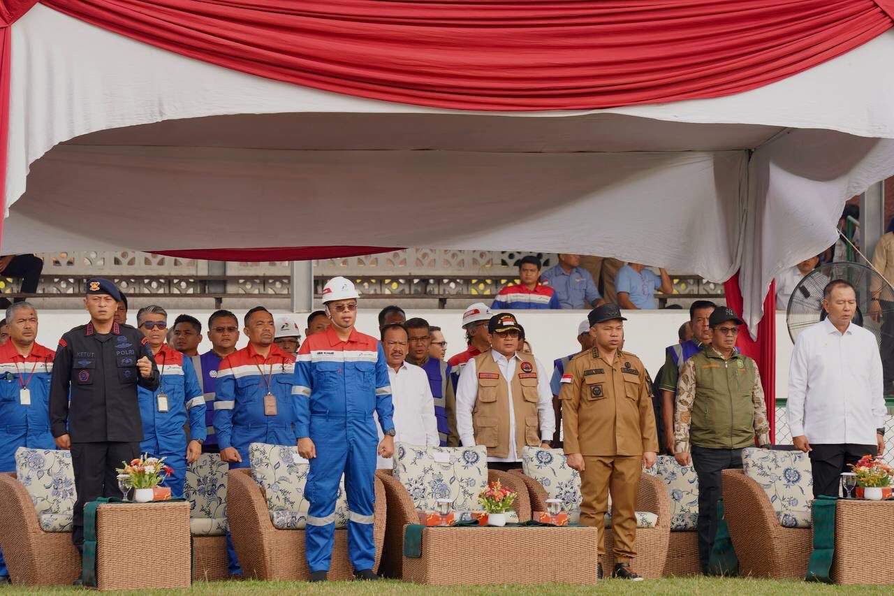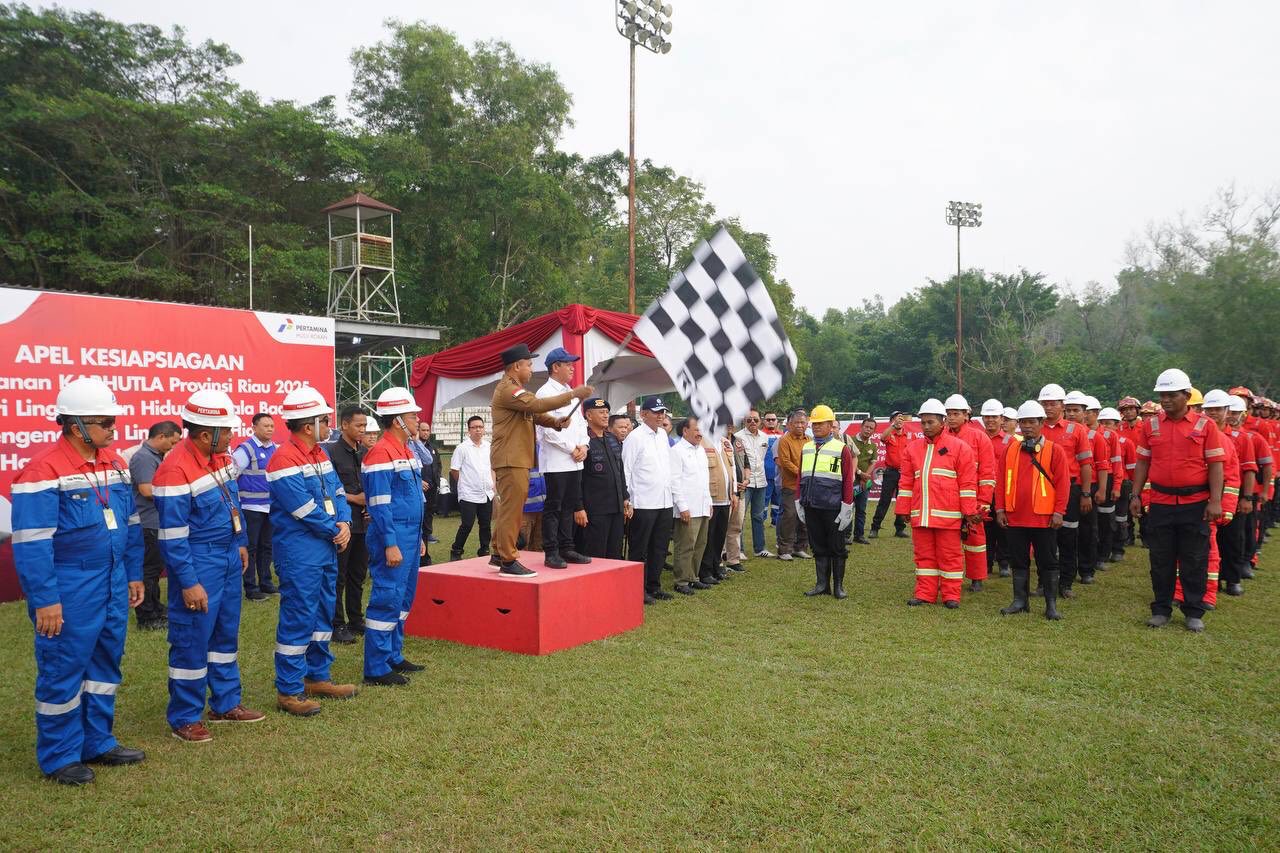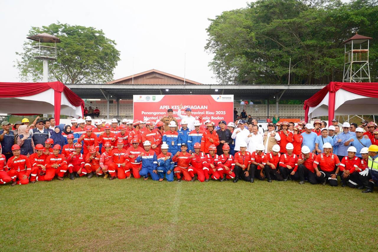 Pemerintah Provinsi (Pemprov) Riau menggelar apel kesiapsiagaan kebakaran hutan dan lahan (Karhutla) Riau di Lapangan Sepakbola Sungkai, Komplek Perkantoran PT PHR Rumbai, Pekanbaru, Kamis (24/7/2025). Apel tersebut dipimpin Menteri Lingkungan Hidup (LH) RI, Hanif Faisol Nurofiq dan dihadiri Gubernur Riau (Gubri) Abdul Wahid, Forkopimda Riau.
